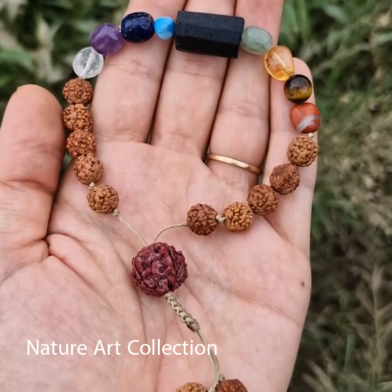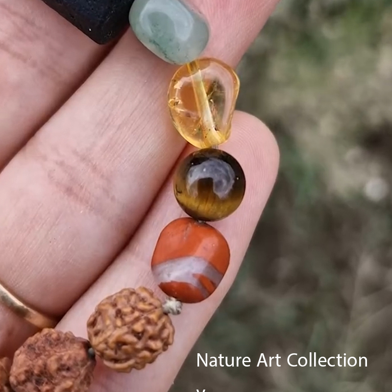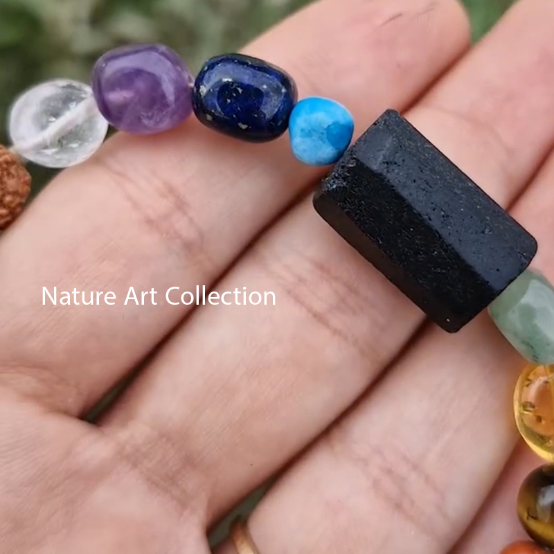این دستبند از سنگ های طبیعی ومعدنی با بهترین کیفیت ساخته شده است.سنگ های به کار رفته در این کار تورمالین سیاه در وسط دستبند از سنگ های حفاظتی هاله بدن /سنگ های هفت چاکرا متعادل کنده انرژی یین ویانگ بدن /سنگ جاسپر سرخ،سنگ چشم ببر،سنگ سیترین،سنگ آونترین سبز ،سنگ لاجورد،سنگ آمیتیست ،سنگ کریستال کوارتز/دانه های هسته رودراکشا با خاصیت افزایش آرامش و تعادل انرژی بدن.